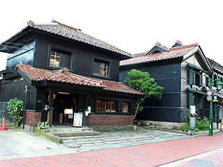 写真の右が嘉永3年(1850年)創業の末廣酒造・嘉永蔵、その左が『蔵喫茶 杏』。