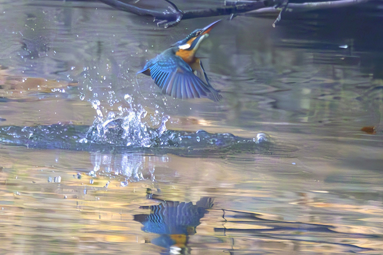 この日は風が穏やかでしたので、水面にカワセミのリフレクションが映りました。