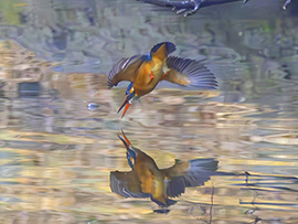 写真は、瞬間の魔術師T.sakumaの野鳥ギャラリー2よりカワセミが川に飛び込もうとする瞬間。水面が穏やかなので、鏡合わせのように見えます♪