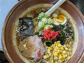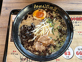 写真は、JUNの海外駐在員便り「帰国後の日々編」から、花月の期間限定ラーメン『黒マー油ラーメン「味千」』。トンコツ好きな太太さんのご注文。