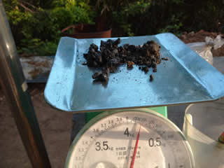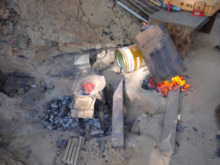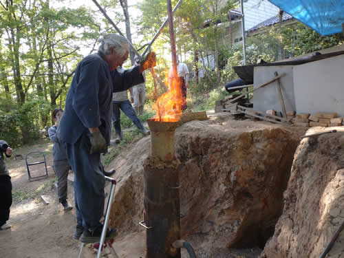 炭と砂鉄を交互に入れて、クロガネ君の実験開始。