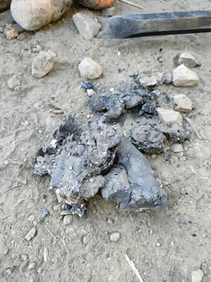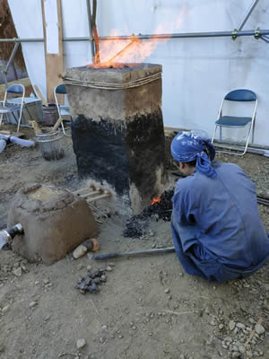 右が箱形炉。左奥がミッシェル先生自作の手で風を送る皮ふいご。