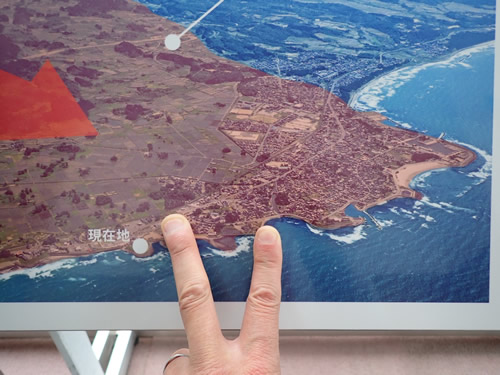 江戸時代の浮島の絵図(隆起前)と現代隆起地形を見比べられる。