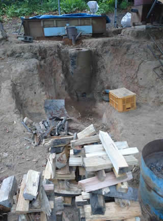 炉が上まで塞がり、乾燥用の薪割りは村下自ら割る。あとは煙突。