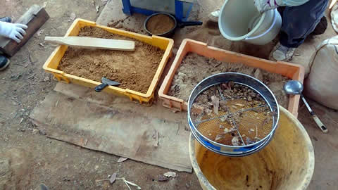 炉の外壁用の地元土。別々の地点で色や粒子が違います。