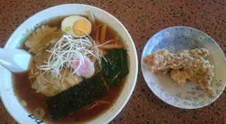 基本おいわけラーメンとゲソ天。夏は冷たいラーメン。冬は赤ネギ。