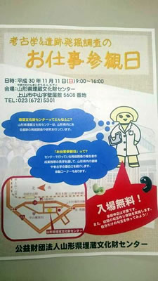 当日はミニミニ発掘体験、整理作業体験、縄文中期の羽黒神社遺跡と晩期末~弥生初頭の収納前の上竹野遺跡のミニミニ展示、琥珀勾玉作り、センター初の西の前土偶と押出彩文土器の野帳販売などがあります。