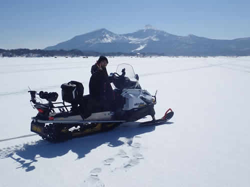 福島埋文の漁師さんのスノーモービルをお借りして裏磐梯 山と。
