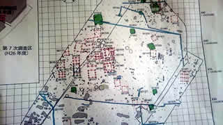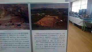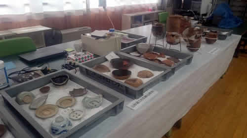 現説は雨で埋まりましたが、今回 は古代の不整区画と建物がみえる空撮と復元土器あり。