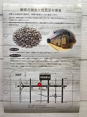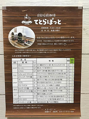 自家焙煎珈琲「てとらぽっと」です。 当店では焙煎前に手選別を繰り返し、味に悪影響を及ぼす欠点豆を徹底的に除去していますので、その豆が持つ本来の味わいとスッキリした後味をお愉しみいただけます。