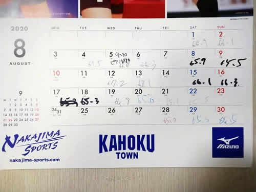 お盆前後に戻るも笑、月末やつと65キロ切る。