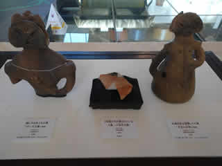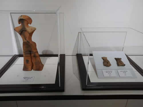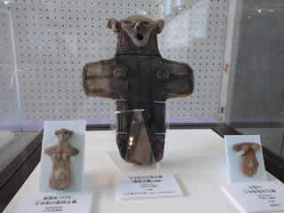 板状土偶の大小。真ん中が三内丸山遺跡。