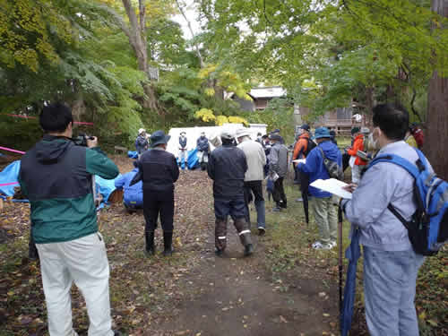 手前から新聞記者さん、名和さん、大類さん(指差し)、阿子島先生、作業員さん、中嶋さん。後ろに保角さん。