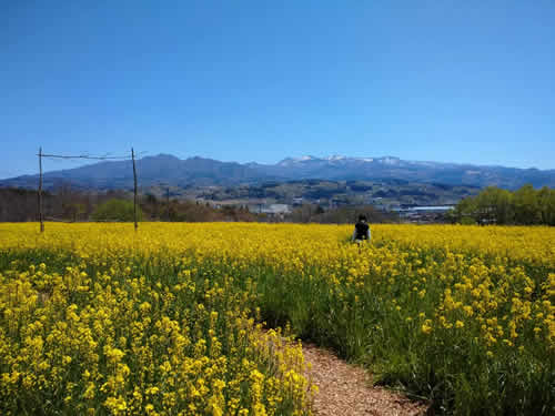 旧センター(弁天)前の菜の花迷路と蔵王。