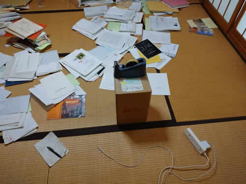 隣の部屋で段ボールとセロハンテープ台を携帯置場にして終日過ごす笑