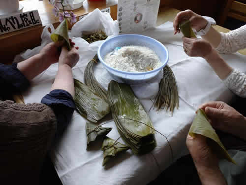 おいわけの父ちゃん母ちゃんと笹巻の作り方を習う。