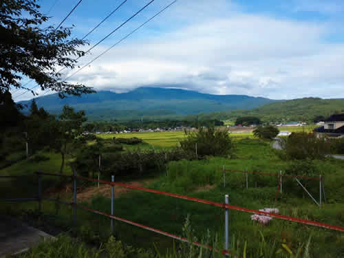 水田を挟み、右奥の茶色部分が発掘体験の杉沢C遺跡。
