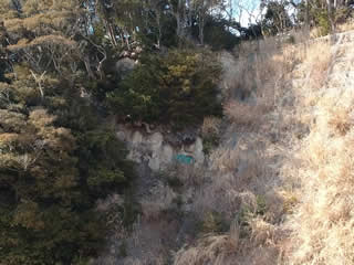 白い土嚢袋無いなーと探してたら、崖の壁の上の方に緑色塊が…。