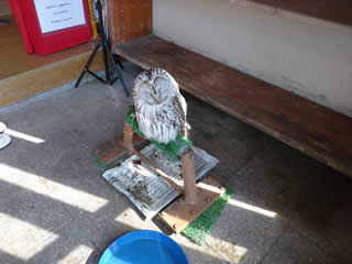 水心子正秀近くのふくろう推しの神社玄関の本物ふくろう! 。