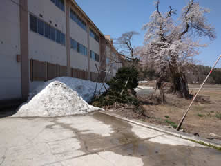 まだ建物北側の影に残る雪と桜。