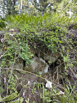本丸の草に覆われた古相の野積石垣。