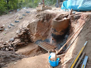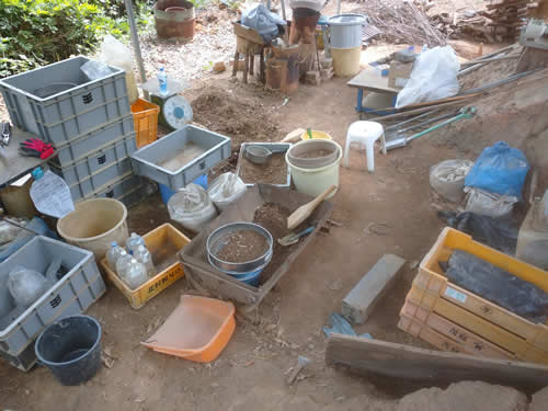粘土の材料、赤土潰して粉作り。