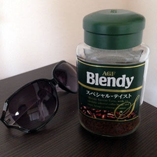 サングラスと写っているインスタントコーヒーが、貰い物です。
