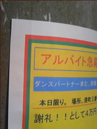 よく見ると、代わりに男性が立っていた街灯に、赤や緑、黄色で縁取られたド派手なチラシが支柱に貼ってある事に気付く。