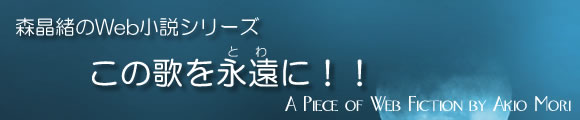 森晶緒です。このコーナーでは、私の書く小説をお届けしたいと思います。まず、最初のストーリーは「この歌を永遠に!!」。 求職中の主人公、新翔 明(しんとび あける)は、ある夜更けの出会いから数奇な運命に巻き込まれて・・・
