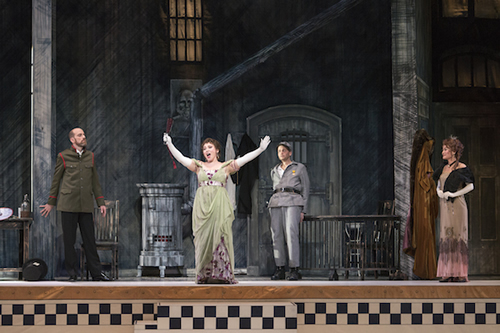 第3幕 刑務所で茶番劇。左から刑務所長、抹茶色のドレスを着た