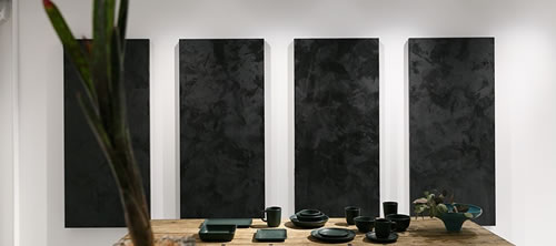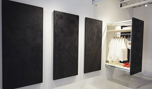 黒い板が部屋の側面に10枚ほど架けてあるだけなのだ。もちろんこの黒板を引っ張るとそこには服だとかバッグだとか陶器が収納されている。言ってみれば、お楽しみのブラックボックスと言ってもいいかもしれない。