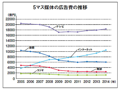 一方、「時代の寵児」であるインターネット広告に関しては、リーマン・ショックで減ることもなく、順調に金額を増やし2014年には1兆円の大台に乗せた。テレビとの2強時代も射程に入っている。