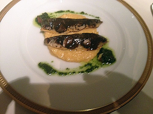 私も見た瞬間、鮎を甘く煮てバジル風味のスクランブルエッグの上にのせるなんて、なんとバカなことするのかと思ったが、これが食べてみると、ああフランス料理ってやはり素晴らしい、ということになる。