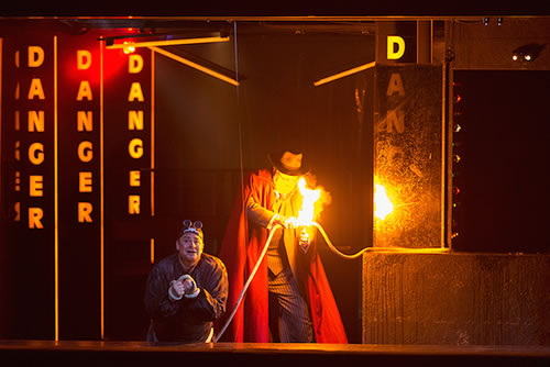 弟のミーメから兄アルベリヒの悪事の詳細を聴取する火の神ローゲ(右)