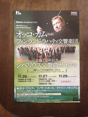 ②オッコ・カム指揮ラハティ交響楽団シベリウス交響曲3番&4番他(オペラシティ):地方都市オーケストラだがシベリウス生誕150周年イヤーの白眉