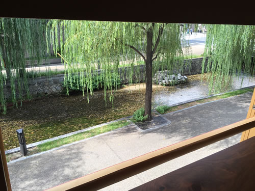 2階には大きなテーブルがドーンとおいてあって見知らぬ者同士が隣り合わせで食事をするカジュアルさをコンセプトにしている。この2階から見える白川と柳が絶景なのである。