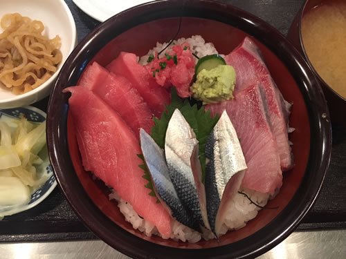 写真の三色丼(ぶり、締めサンマ、中トロ、中落ち)1200円は、この六本木・西麻布地区では出色の存在。