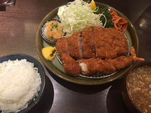 写真はロース定食1450円とエビフライ450円。4店の中では一番リーズナブル。