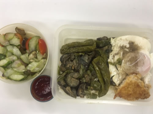 ①ナス&ピーマンの味噌炒めに②シシトウの甘辛煮を乗っける。③メンチカツのまさに残片、④目玉焼きだけは朝焼いた。