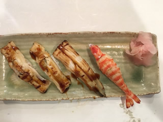 そういう面倒くさいのが嫌いな方には同夜最後に無料のアラ汁とともに食べた握り穴子三貫と車海老の握りの皿(価格不詳。たぶん1200円程度)をベストディッシュとさせていただく。