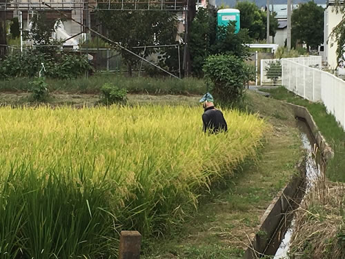 大原医療センターから阿武隈急行の卸町駅への帰り道の稲田で農夫?と思いきや案山子(かかし)だった。のどかな田園風景。