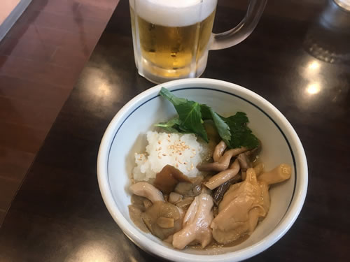 新幹線を待つ間に駅の蕎麦屋 「丸松」にて生ビール580円とキノコおろし380円。