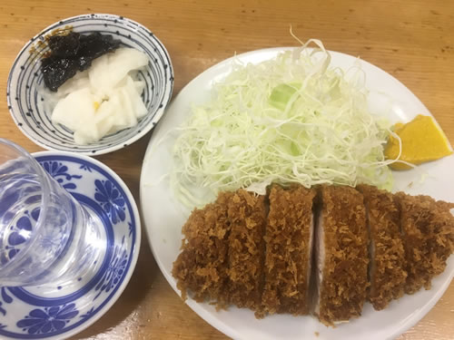 夕食は東京に戻ってから、高田馬場「いちよし」でロースかつ単品(540円)、キャベツ100円、常温「月桂冠 恒の月」310円、漬物50円、イカフライ130円、しじみ汁100円。