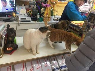 神社近くの開運グッズを売る商店には猫だらけ! 招き猫というわけ。