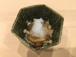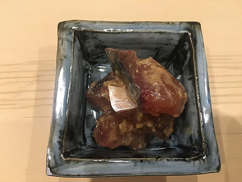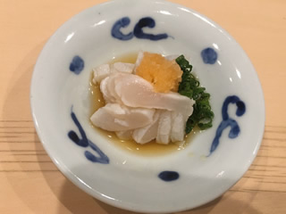 酒は最初に福岡県糸島産の田中六十五の冷1合と佐渡産の北雪の純米ぬる燗2合7勺半。この北雪のぬる燗がこの店のツマミと寿司にピッタリで飲み過ぎた。