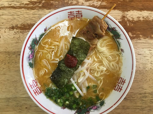 チャーシューの代わりに、小さい豚の角煮が串刺しになったもの、海苔の上に辛子味噌が載り、もやしが加わる。