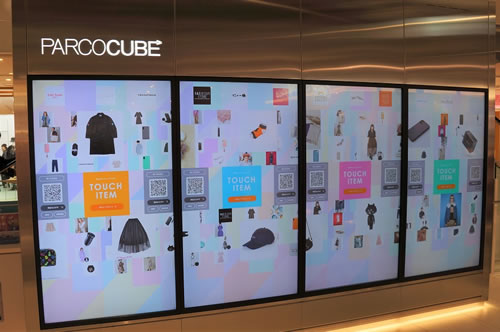 たとえば5階の「パルコキューブ」では、まず入り口にある巨大なサイネージで出店している11ショップの商品データや在庫を見られる。