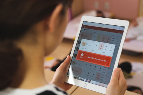 園児の生体データをタブレットで読む保育士 |
