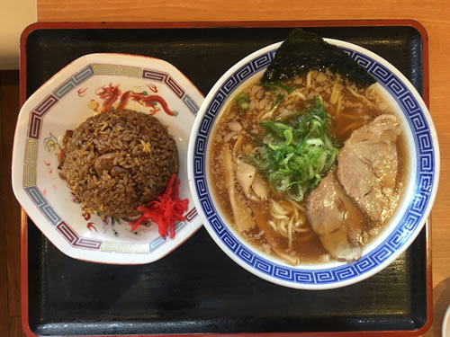 ランチセットAは本丸醤油ラーメン背脂少々と黒チャーハンセット803円(税込)。ウ、ウマイ!