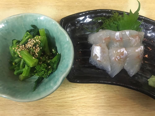 まず、ほうぼうの刺身(500円)と菜の花の芥子和え(350円)。↑
